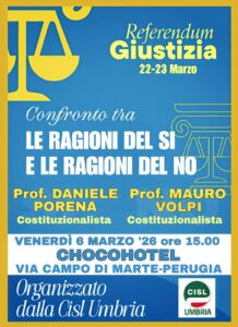 Referendum Giustizia, confronto fra il sì e il no L’incontro, organizzato dalla Cisl Umbria, si terrà a Perugia il 6 marzo 2026 ore 15,00
